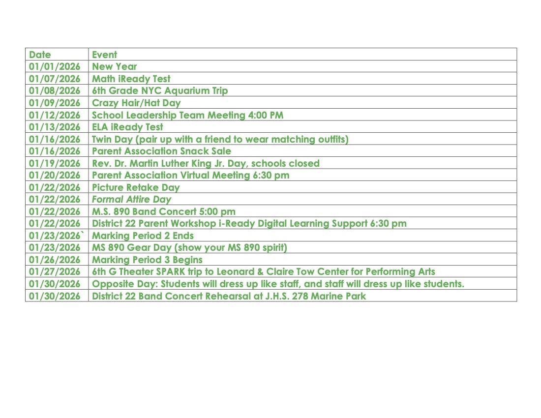 Middle School 890 January Calendar