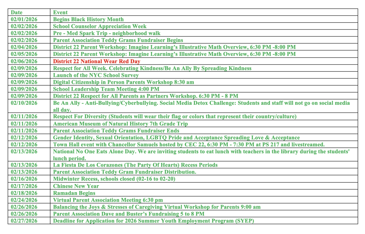 Middle School 890 February Calendar