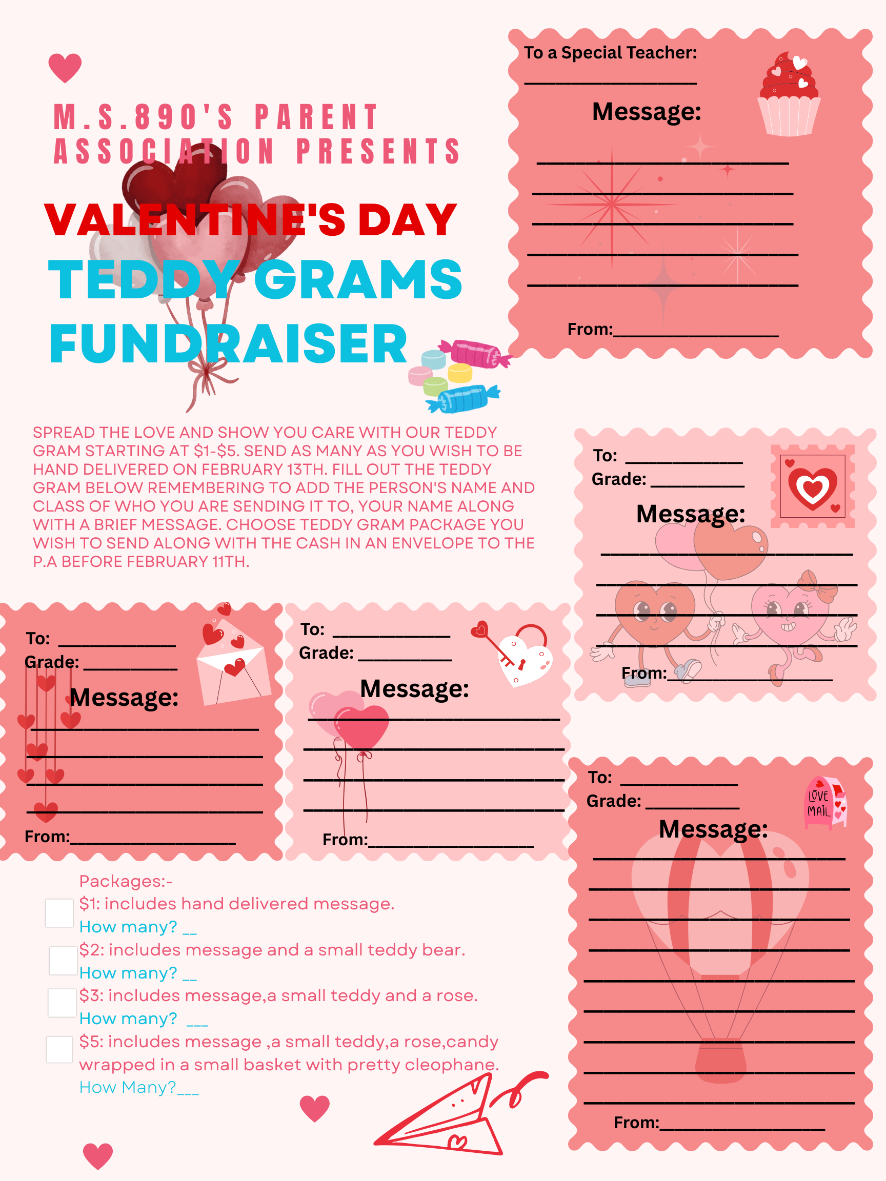 Students will be able to purchase teddy grams. Priced at $1-$5. Student will be able to submit the cash to the Parent Association. See Flyer for more details.